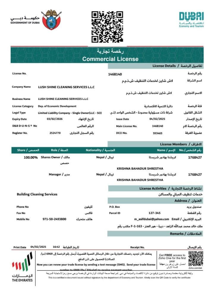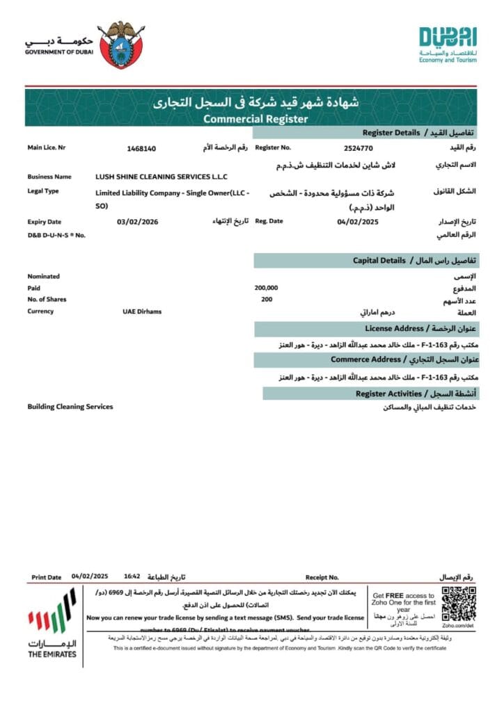 We understand that trust and reliability are essential when hiring a cleaning service. That’s why we proudly display our official cleaning company license, ensuring that we operate under Dubai’s strictest cleaning and hygiene standards. Our license guarantees our commitment to professionalism and quality.